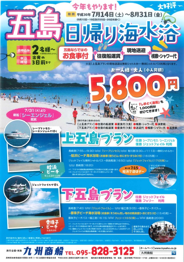 昨年大好評でした。九州商船の日帰りパックが発売されました。昨年同様に上五島の海を満喫してください。みなさまのご来島をお待ちしています。
