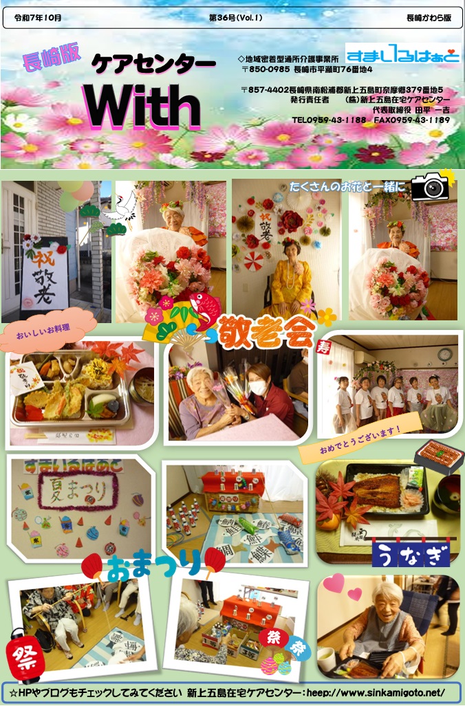 在宅ケアかわら版👀デイすまいる(ケアセンターWITH・長崎版)~第36号~ 投稿者:nagasaki 投稿公開日:2025年10月3日 投稿カテゴリー:ブログ おすすめ こいのぼり作り🎏~Lian南ヶ丘~ 2021年4月12日 花いっぱい運動 2015年6月27日 春の散策~Lian南が丘~ 2016年4月2日