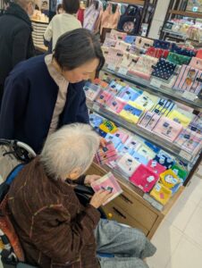 車椅子でアーケードを「懐かしかぁ~」と眺めながら通り、浜屋では好きな柄のハンカチとバッグを娘さんに