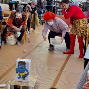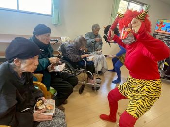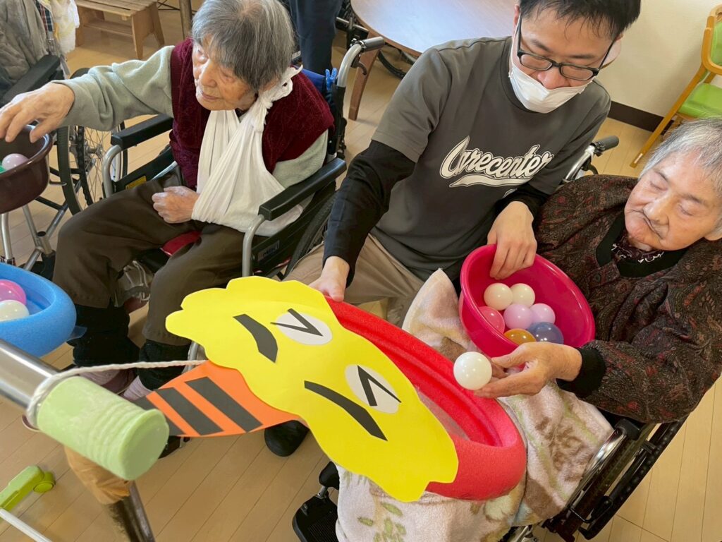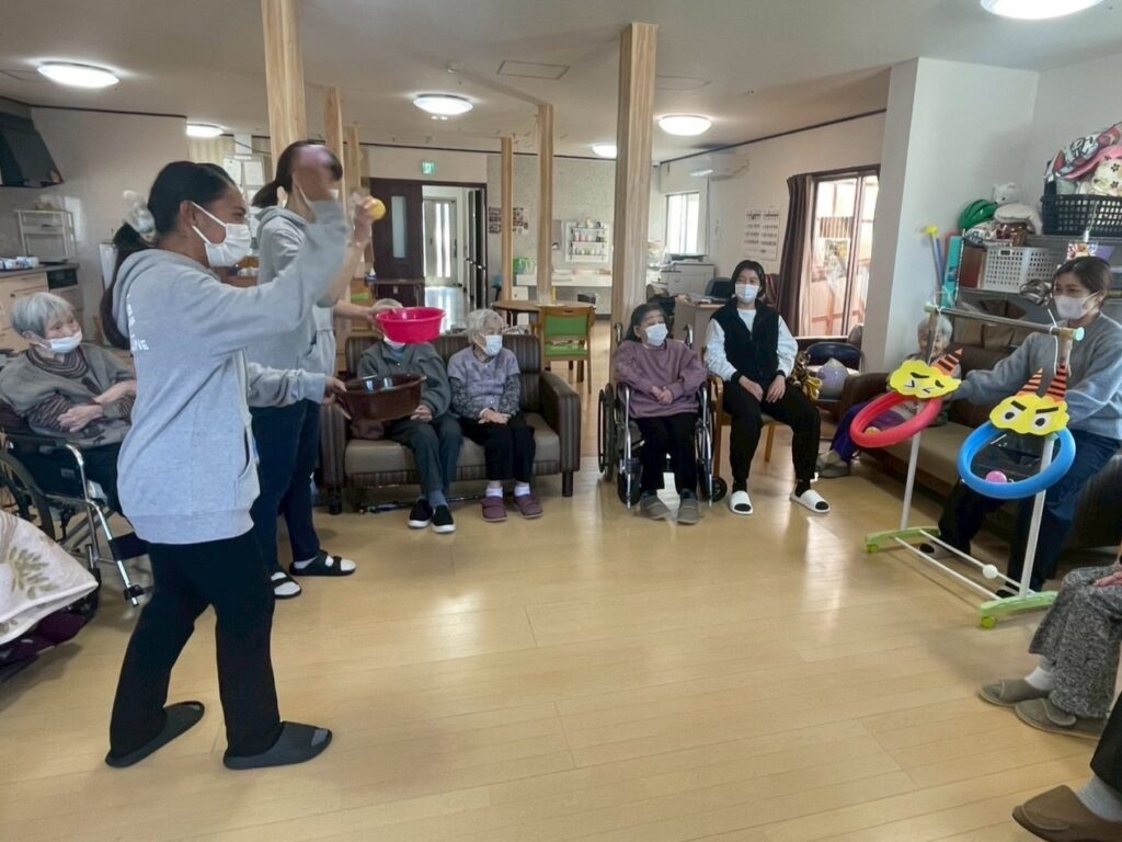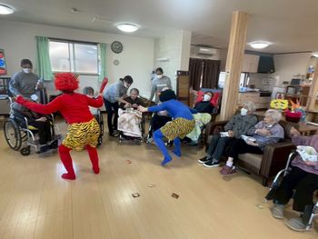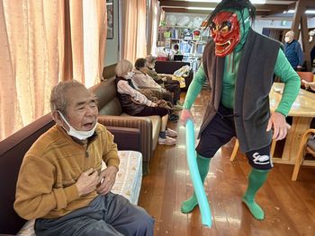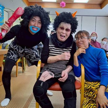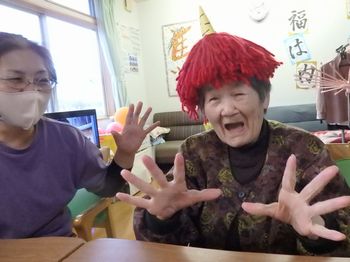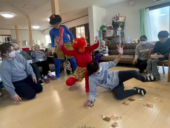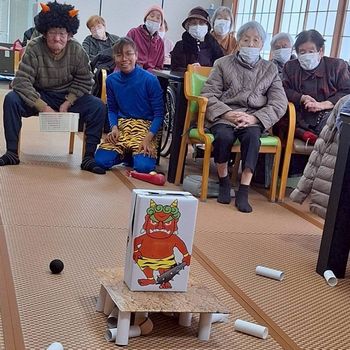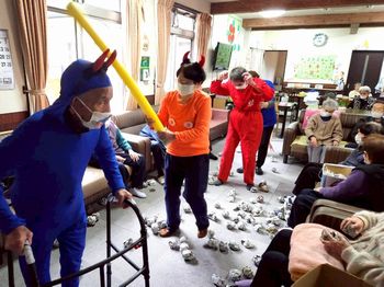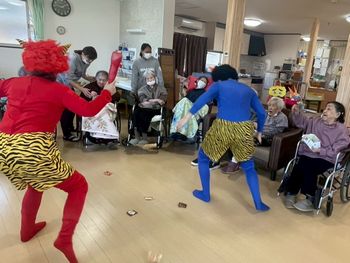 節分👹デイサービス デイサービスの節分はお客様からの盛大な拍手で 赤鬼と青鬼が登場して鬼のパンツの踊りを披露🎶 丸めた新聞紙を豆に見立てて鬼退治! 鬼を退治する力強さで病気に負けず元気に過ごせるよう祈願しました🌟