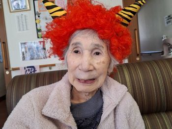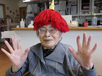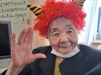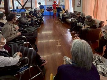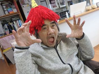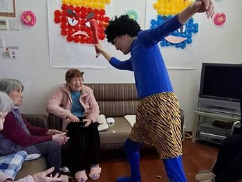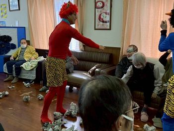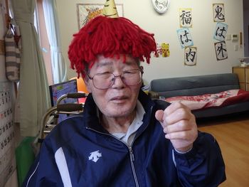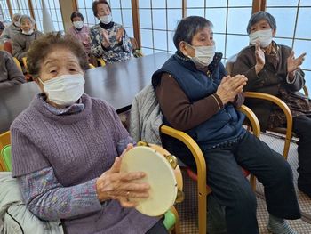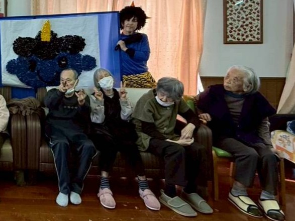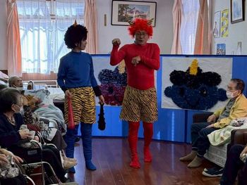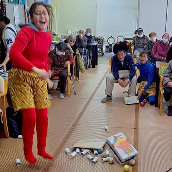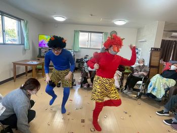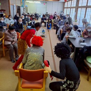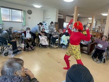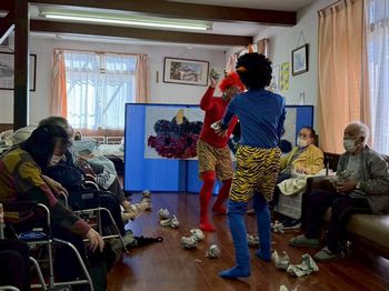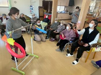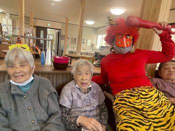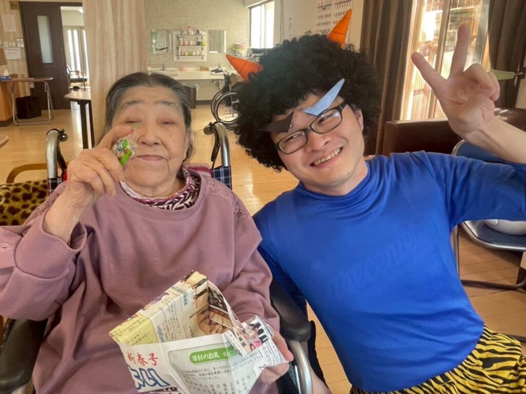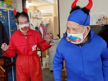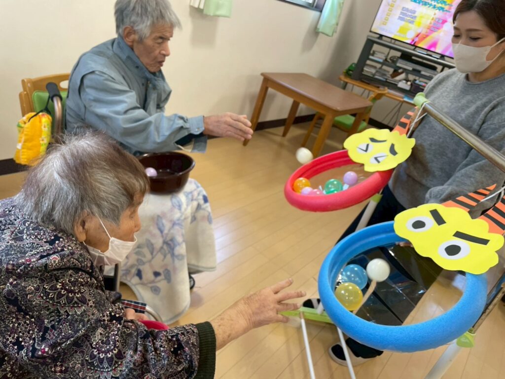 節分👹デイサービス デイサービスの節分はお客様からの盛大な拍手で 赤鬼と青鬼が登場して鬼のパンツの踊りを披露🎶 丸めた新聞紙を豆に見立てて鬼退治! 鬼を退治する力強さで病気に負けず元気に過ごせるよう祈願しました🌟
