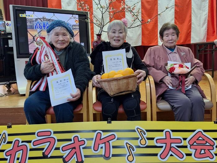 カラオケ大会🎤たかのしの杜 ボケの花が咲き始めた たかのしの杜でカラオケ大会を行いました! エントリー10名によるガチバトル🎤🎶 高得点の連続で応援団にも力が入り大盛り上がり👏 上位3名のお客様に賞状のお渡しと記念撮影📷✨ 皆様また早くも次回の開催を楽しみにしているご様子でした😊
