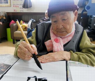 なごみの書初め 「私や無理よ~」といいつつも…… やはり、とても達筆でございます。筆をとる姿も真剣そのもの。 迎春・健康・元気・矢堅目など個性豊かな文字が今年もなごみの壁を彩りました。 今年も健康で、元気で、楽しい年になりますね