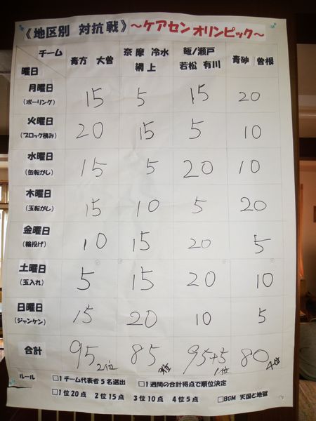 地区別対抗戦終了~デイサービス みなさま一生懸命に上を見て何をしているのでしょうか? そう、カゴを目指して玉入れをしていますね♪ 1週間、日替わりで色々な対戦をして白熱した対抗戦もいよいよ最終日を迎えました。 接戦を制し、優勝したのは「有川・若松」連合チームでした! 最後までチームワークばつぐんで、対抗戦を盛り上げてくれました。 優勝できなかったチームのみなさんもお疲れさまでした
