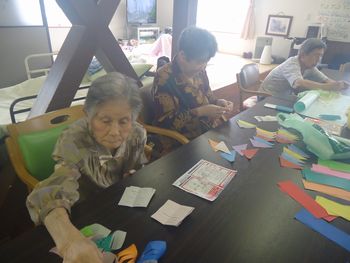 6月のデイサービス☔ 「梅雨入りしたとかねー?」 との声が聞こえる中、 室内では七夕飾りや輪なげゲーム、 野外では魚釣りや日光浴を楽しみました(*^-^*) お散歩の時には保育園の子供たちと 「こんにちは」「何をつかまえたの?」と会話を弾ませ、 「またきてね!」と声をかけられると、 「みじょかねーー」と嬉しそうにされていました(*^-^*)