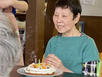 お誕生日会🎂デイサービス 11月生まれのお客様2名のお誕生日会を行いました! 生まれた年も同じの同級生です(*^-^*) プレゼントのお渡しは デイサービスのご長寿代表から! ハッピーバースデイの歌を歌ったあと、 介護員手作りのケーキを皆様「おいしい」と ニコニコしながら食べて下さいました(*^-^*) デイサービス若手のお二人、 お誕生日おめでとうございます! これからも元気にお過ごし下さいね(*^-^*)