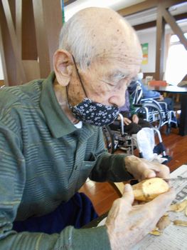 手作りおやつ🍠デイサービス 今年もお客様とイモだんご作りを行いました! さつまいもの皮を剥き、 丸めて団子を作る作業を 皆様 手際よく進めて下さいました(*^-^*) さっそくおやつにいただき、 「おいしかよ!」 「もっとなかとね?」と 口々におっしゃっていました(*^-^*)