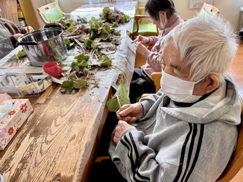 春のアクティビ💪たかのしの杜 暖かくなって「春が来た!」と旬の金柑を楽しみ、 「香りがいいね」と好評いただきました♫ 「煮物にして食べたいね!」とツワの皮剥きや 折った鶴を貼り付けて飾りを制作しています(*^-^*) お客様から畑で獲れたブロッコリーをいただきました!(*^▽^*) いつもありがとうございます(*^▽^*)