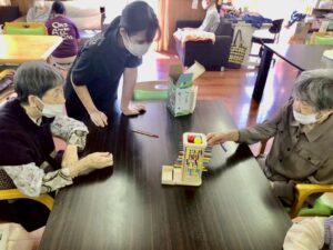 7月のデイサービス 日中暑い日が続き、 室内での活動を中心にカラオケや 新しいゲームをして過ごしました(*^▽^*) 夏休みに入ると遠方よりお子様やお孫様がいらっしゃり、 「元気にしてた?」「大きくなったね」と 久しぶりの再会に喜ぶ姿が見られました♫ 暑さに負けず、8月も元気に過ごしましょう!!