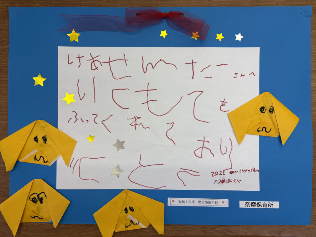 奈摩保育所の園児たちが勤労感謝の感謝状を持って来てくれました!
